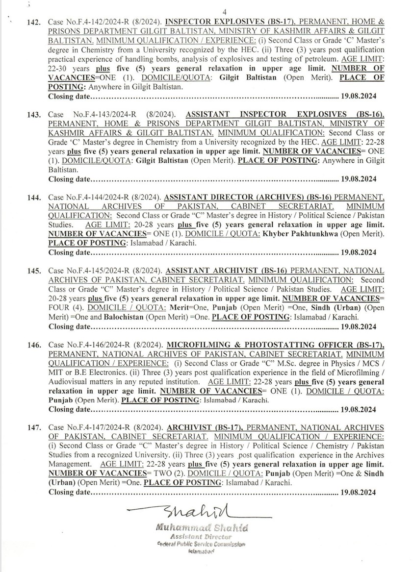 Assistant Inspector Explosives (Bs-16). Permanent. Home & Prisons Department Gilgit Baltistan, Ministry Of Kashmir Affairs & Gilgit Baltistan. Minimum Qualification: Second Class Or Grade 'c' Master's Degree In Chem Istry From A University Recognized By The Hec. Age Limlt: 22-28 Years Pl Us Live (5) Years Gen Eral Relaxation In Upper Age Limit. Number Of Vacancies= One ( I ). Domicil E/quota : Gilgit Baltistan (Open Merit). Place Of Posting: Anywhere In Gilgit Baltistan.